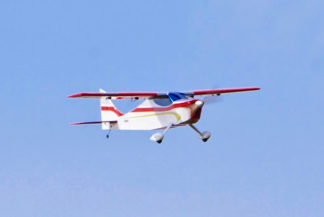 Der Prop- und Motor-Sound passen gut zum Slappy und seiner Luftpräsenz. Bei rd. 6.000 U/min. fließen gute 80 A und der Slappy zieht endlos senkrecht in den Himmel. Die Fluggeschwindigkeit ist mit dem montierten 24x10 Prop eher mäßig, was dem Slappy m.E. aber auch gut zu Gesicht steht. Einfacher klassischer Kunstflug liegt ihm und macht viel Spaß. Der Slappy rollt für einen Hochdecker erstaunlich sauber. Im Rückenflug muss nur wenig gedrückt werden.